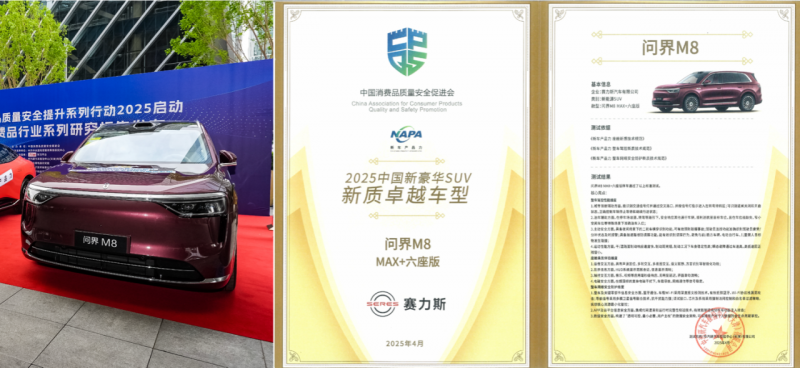 2025年4月18日,由中国消费品质量安全促进会(以下简称促进会)在京举办的“中国消费品质量安全提升系列行动2025启动暨2025消费品行业系列研究报告发布”活动上,中国消费品质量安全促进会马吉军秘书长、中国汽车技术研究中心李洧副总经理为赛力斯汽车AITO问界BG智能测试平台总经理朱红霞发放测试结果证书,宣布问界M8 MAX+六座版车型高质量完成了相关测试,荣获“2025中国新豪华SUV新质卓越车型”称号。