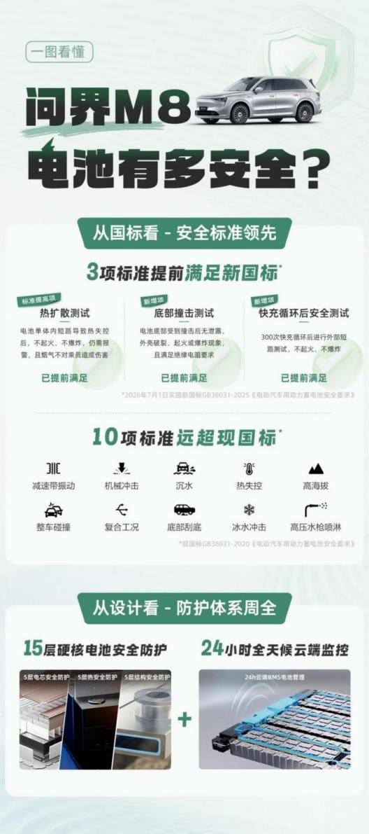 众所周知,电池是新能源汽车的核心部件。问界M8在电池安全上的投入可谓不遗余力,其电池系统在设计之初就严格按照领先安全标准进行打造,并在热扩散测试、底部撞击测试、快充循环后安全测试3项标准方面,提前满足新国标要求。
