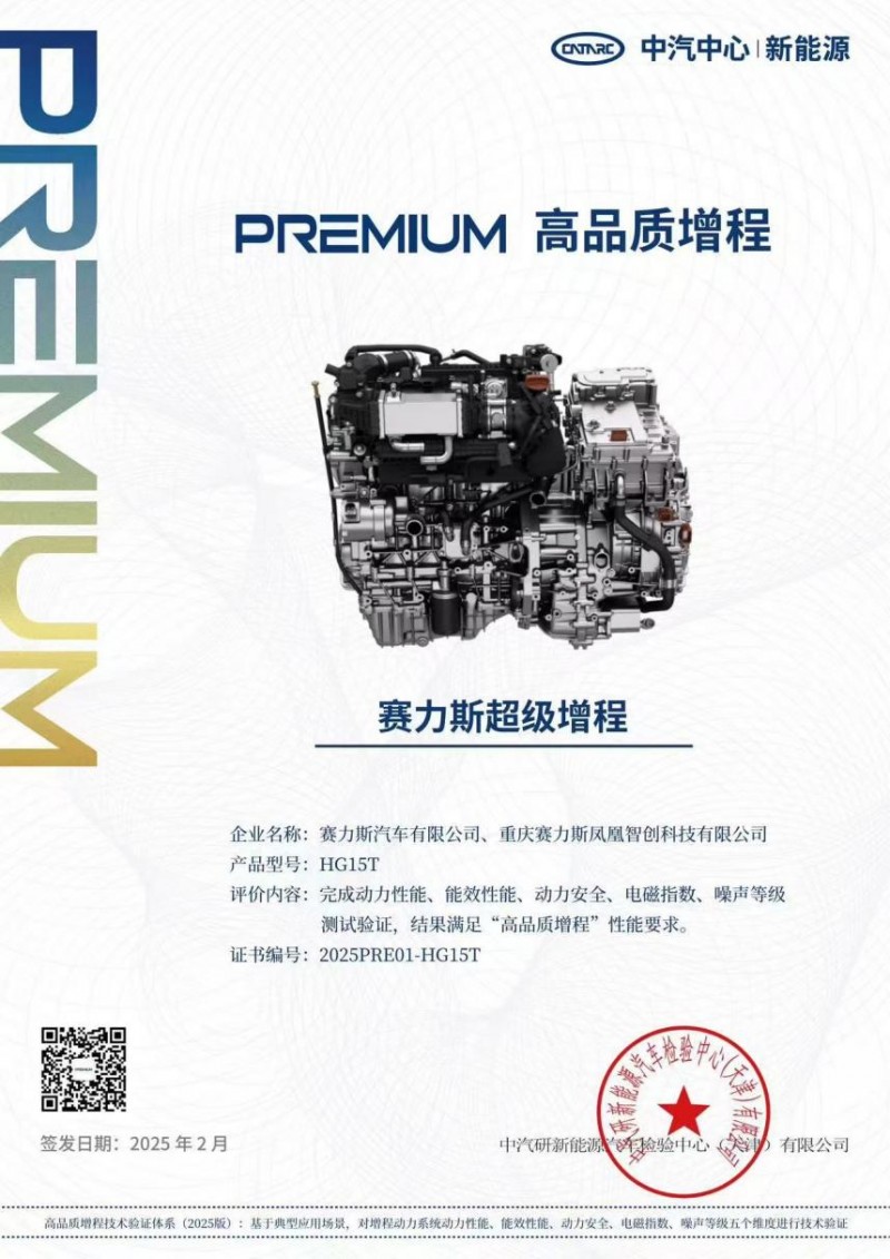 今年4月17日,全新一代赛力斯超级增程系统通过中汽中心“Premium Drive高品质增程”认证,成为首批通过该项认证的增程动力系统,再次印证了赛力斯在增程技术领域的技术积累和领先优势。