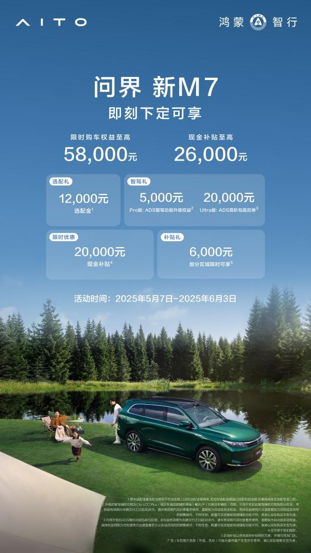 自2024年推出以来,问界新M7累计交付量突破30万辆,是家庭首选的国民SUV。值得一提的是,为回馈用户的喜爱,官方还限时推出多重购车好礼,即刻下定问界新M7,您将有机会尊享至高价值58000元限时购车权益,现金补贴至高可享26000元。如果您正在寻找一款能满足家庭需求的豪华SUV,问界新M7就是不二之选!