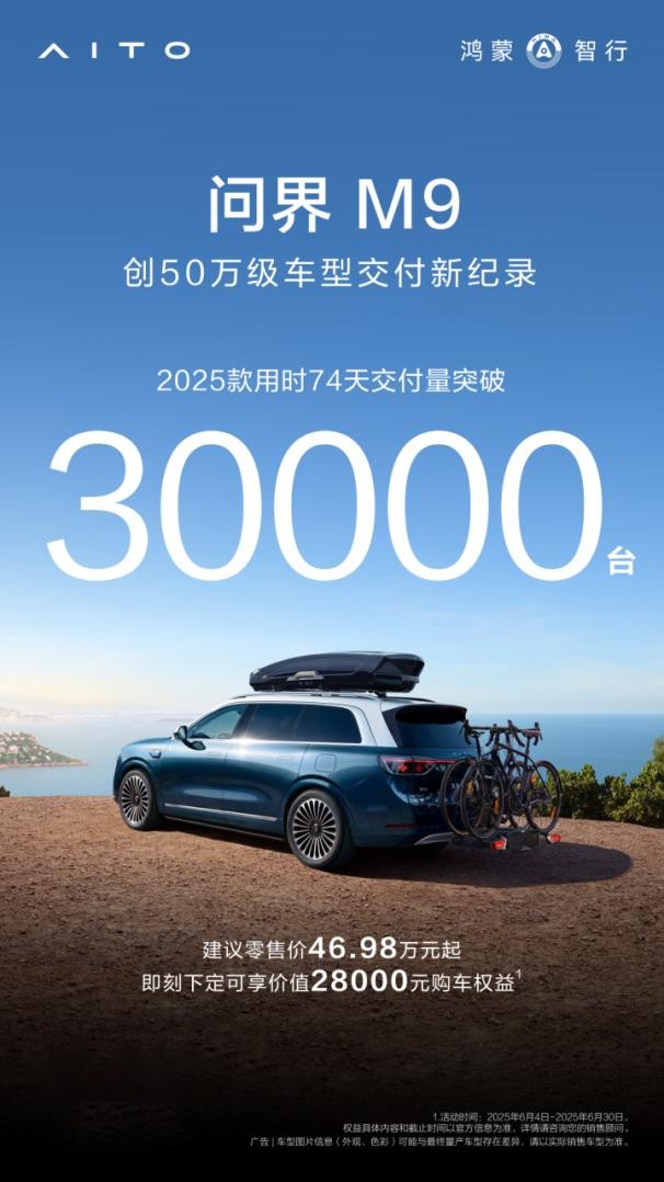 如今,问界M9累计交付已突破20万辆,持续巩固其在中国豪华车市场的标杆地位。其中,问界M9 2025款上市仅74天累计交付量突破3万台,一举刷新了50万级豪华车交付新纪录,以硬核实力务实科技豪华价值标杆地位。