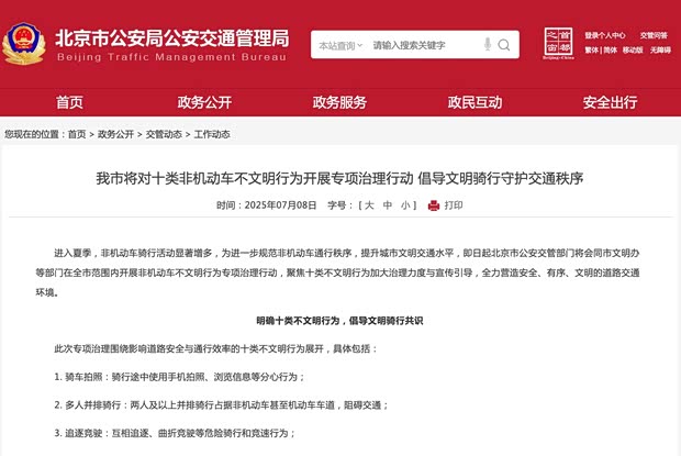 [本站 资讯] 近日,北京市公安局公安交通管理局发文表示,自7月8日起,将对北京全市范围十类非机动车不文明行为开展专项治理行动,倡导文明骑行守护交通秩序。交管部门将强化路面执法,并采取科技手段精准查处,利用视频、图像等资源发现非机动车不文明行为,通过电动自行车车牌识别追溯违法主体,进行追查处理。