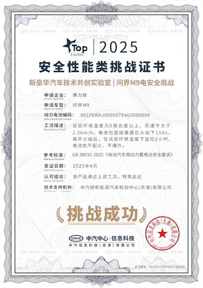 近日,在问界与中汽中心共建的问界新豪华汽车技术共创实验室,开展了一场问界M9 150秒极限电池火烧测试。经过实测,问界M9电池包在700-1000℃高温环境下持续承受150秒直接火烧,静置观察2小时后,电池包始终保持稳定状态,未发生起火、爆炸等热失控现象。这一结果不仅验证了问界M9电池包在极端工况下的可靠性,更全面展示出赛力斯智能安全体系在新能源汽车电池安全领域的领先技术实力。