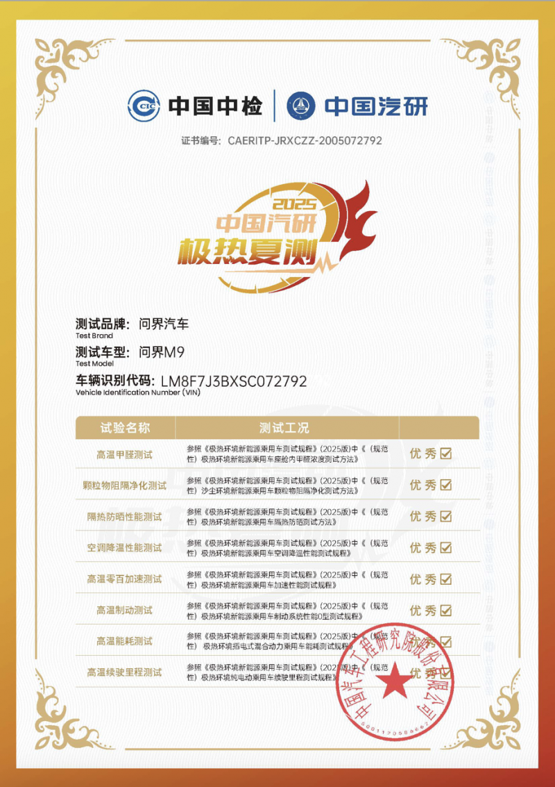 在新能源汽车市场竞争白热化的当下,消费者购车理念日趋理性,从单纯注重产品外观,转向更看重产品的实用价值与科技体验。作为赛力斯与华为联合打造的科技旗舰,问界M9累计交付超20万辆,稳居50万级销冠,其百变空间和智能座舱成为核心竞争力。值得一提的是,在近期中国汽研极热夏测中,问界M9斩获“极热健康车”“极热‘质’造车”双项大奖及8项单项测试优秀奖,成为获得单项优秀科目最多的车型,再次验证了其行业领先地位,为消费者提供了可靠的购车参考。