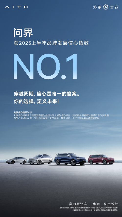 与此同时,问界品牌价值持续提升。据杰兰路《2025年度上半年新能源汽车品牌健康度研究》报告,2024下半年至2025上半年,问界凭借用户对其未来发展的“超强信心”,稳居品牌发展信心指数第一。