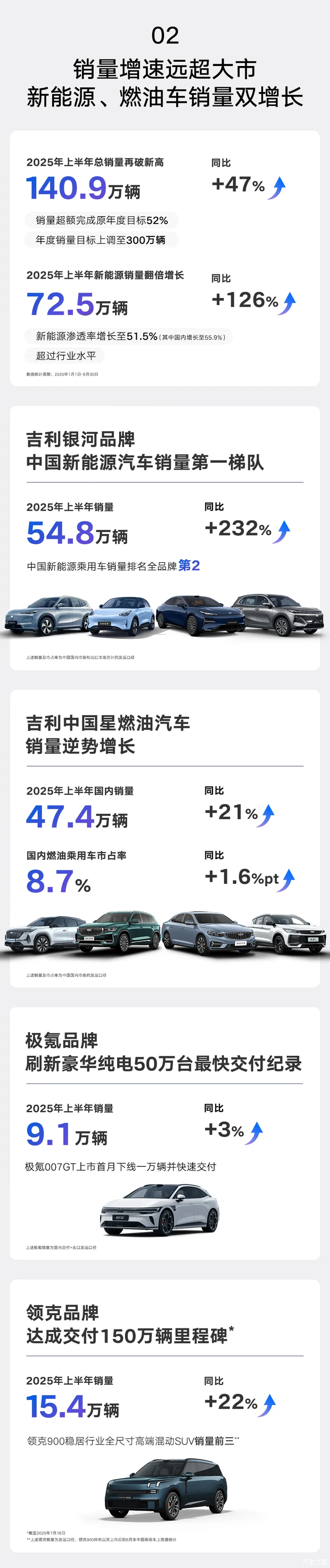 吉利汽车2025年上半年总销量达140.9万辆,同比增长47%;新能源车销量为72.5万辆,同比增长126%,新能源渗透率增长至51.5%。吉利银河上半年销量54.8万辆,同比增长232%;中国星燃油车上半年销量47.4万辆,同比增长21%;极氪品牌上半年销量9.1万辆,同比增长3%;领克品牌上半年销量15.4万辆,同比增长22%,并达成交付150万辆里程碑。(编译/本站 郭辰)