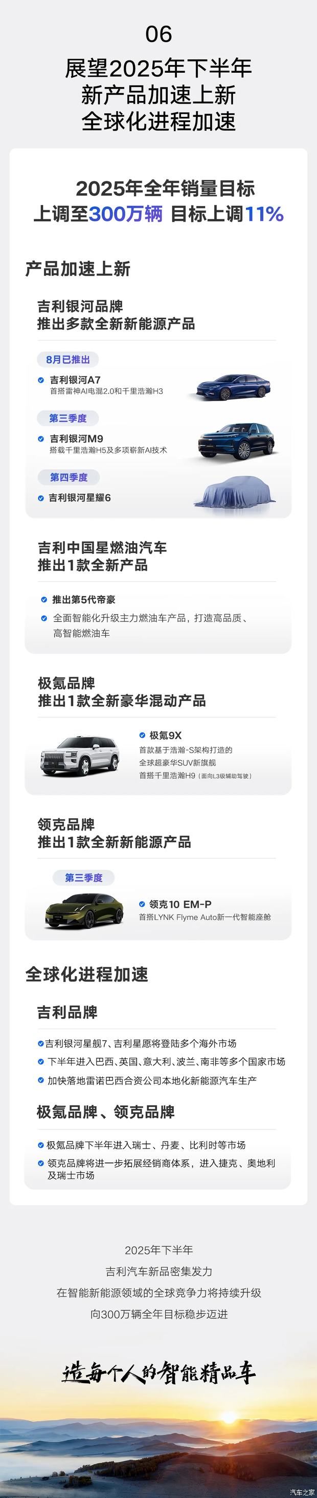 新产品方面,吉利银河M9将于第三季度上市,吉利银河星耀6将于第四季度上市;年内还会推出全新吉利帝豪和极氪9X;领克10 EM-P则将会在第三季度正式上市。出海方面,吉利品牌下半年进入巴西、英国、意大利、波兰和南非等多个国家市场,极氪、领克品牌下半年进入瑞士、丹麦和比利时等市场。
