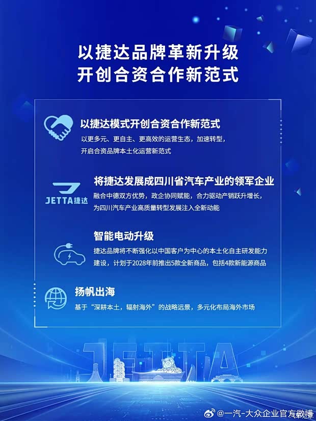 [本站 资讯] 日前,大众汽车集团(中国)、中国一汽与成都经济技术开发区管理委员会签署的《捷达事业发展合作协议》,到2028年,捷达品牌将推出四款面向入门级市场的新能源车型,配备针对该细分市场打造、极具竞争力的技术解决方案。此举也将为大众集团在华史上最大规模的新能源产品攻势注入新动力。