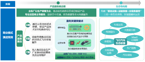 《飞行汽车发展报告2.0》认为,飞行汽车商业模式将沿“耦合产品服务→闭环生态”两阶段演化,最终通过共享运营和平台化服务,构建可持续的立体出行价值网络。