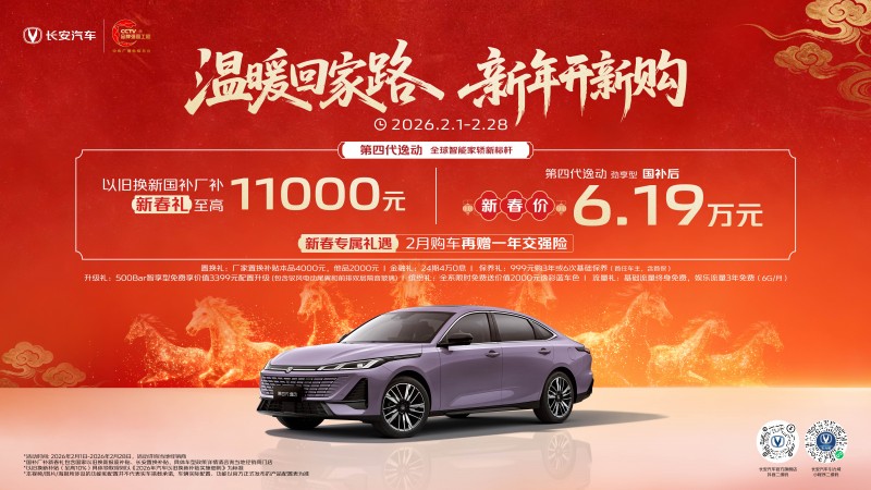 在此次长安汽车“温暖回家路,新年开新购”活动期间,用户下订第四代逸动,可享以旧换新国补厂补新春礼至高11000元!以劲享型为例,国补后仅6.19万元,2月购车再赠交强险!