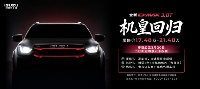 目前,全新D-MAX 3.0T试驾车现已陆续抵达全国经销商门店,欢迎广大车友到店试驾品鉴,亲身体验“机皇”的硬核实力。据悉,新车将于3月20日正式上市,更多性能亮点也将同步揭晓,敬请持续关注。