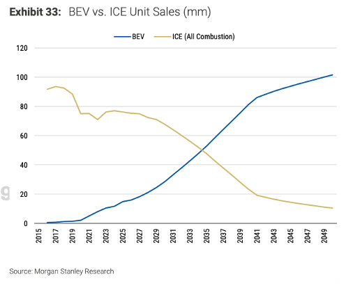 根据摩根史坦利的预测,到2035年,全球纯电动车的销量,将跟燃油车销量持平,到2049年,光纯电动车的销量,将达到1个亿。