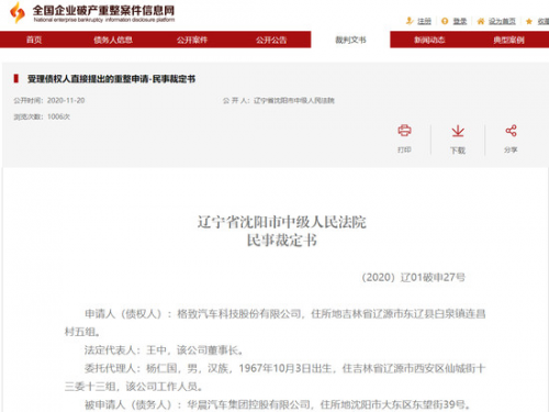 在今年广州车展如火如荼之时,另一则重磅消息引起了笔者的注意。据国内媒体报道,11月20日,沈阳市中级人民法院,裁定受理债权人对华晨汽车集团控股有限公司重整申请,判决书原文如下:“华晨集团存在资产不足以清偿全部债务的情形,具备企业破产法规定的破产原因。但同时集团具有挽救的价值和可能,具有重整的必要性和可行性。”