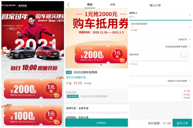 同时,为回馈消费者对“双旦嘉年华”的热情,元旦活动期间,奇瑞捷途增加“1元抢购车抵用券”福利,只需通过捷途官网及汽车之家、拼多多、天猫旗舰店1元下订,即可抢购500-2000元不等的购车抵用券,并可与现金钜惠叠加。