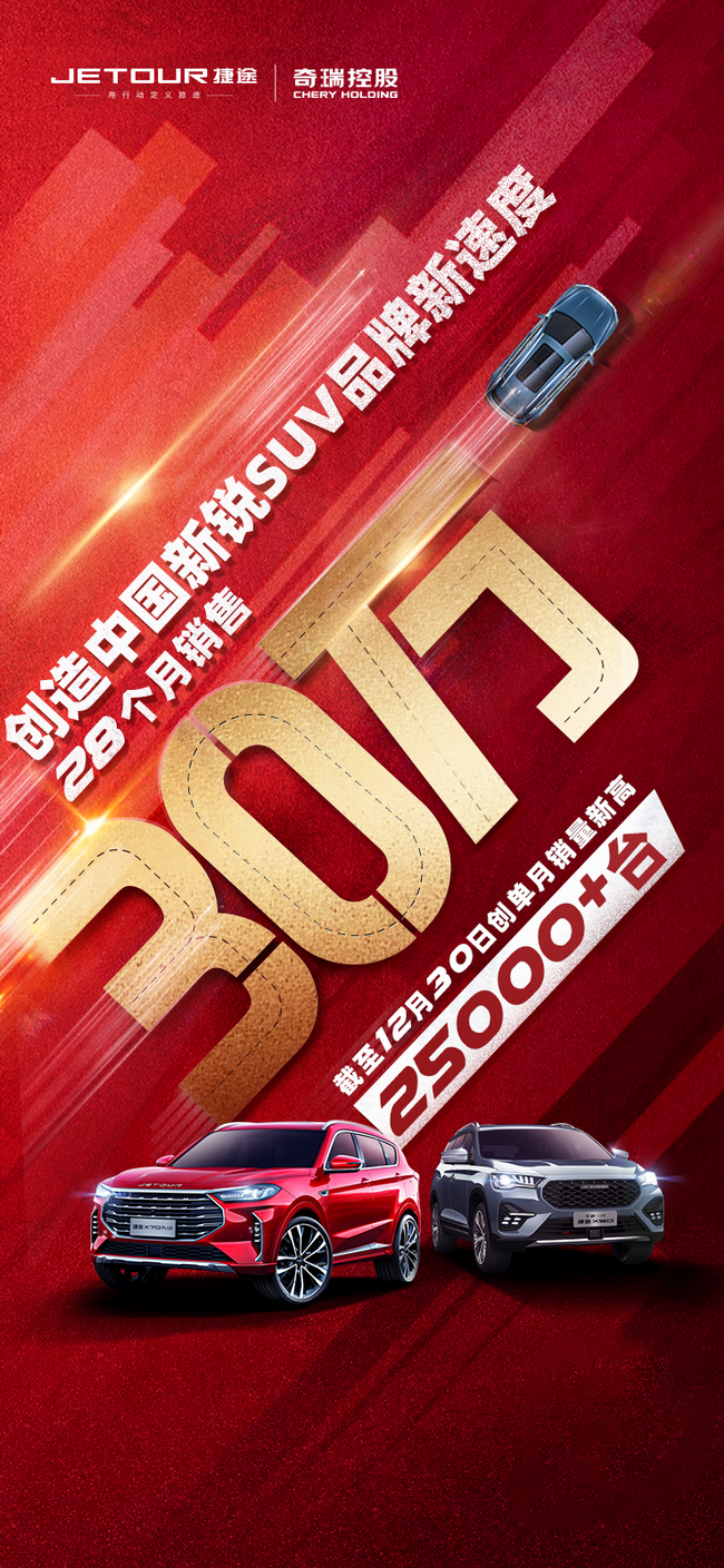 具体产品来看,以捷途X70 PLUS为代表的X70系产品12月销量为到18016辆,同比增长18.50%,环比增长48.70%;以全新一代捷途X90为代表的X90系产品12月销量为8592辆,同比暴增206.75%,环比增长2.40%。自诞生以来,奇瑞捷途累计销量已经突破30万 辆,成为中国品牌第一个在如此短的时间内实现30万销量的品牌,创造了中国新锐SUV品牌销量增长新速度。