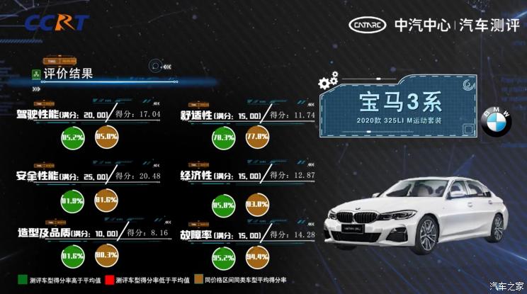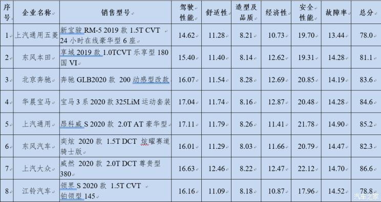 根据消费者购车关注点,选取安全性能、舒适性、驾驶性能、经济性、造型及品牌、故障率六个一级指标进行车辆评价;在100分体系下,如果超过80分,为CCRT推荐车型。