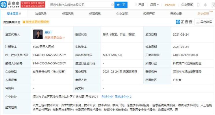 [本站 行业] 日前,我们从互联网获悉,深圳小鹏汽车科技有限公司正式成立。新公司成立于2021年2月24日,注册资本达5000万人民币,法定代表人为小鹏汽车创始人夏珩。