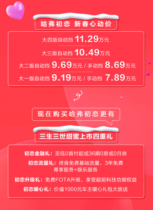 总之,售价7.89—11.29万元的哈弗初恋,在上述“首搭”、“首发”以及“更低”的多方面,体现是其背后的产品策略——就是要让年轻人花11万元左右就能买20万+级的豪华体验,就是要成为“年轻人第一台好车”的首选!而且,现在购车还可享受官方提供的四重大礼包,价格将进一步下探。