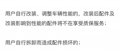 私改,绕不开质保难题。众所周知,在购入商品时,商家会给用户一个保修手册,上面会说明哪些情况不在维保范围内,最常见的一点便是,由于个人原因导致产品损坏或者故障,是不属于免费维修的范围,汽车也是如此。由于私自改装导致汽车发生事故,原则上厂商是不给予救援和质保,这是汽车圈约定俗成的事情,也符合国家质保政策的规定。