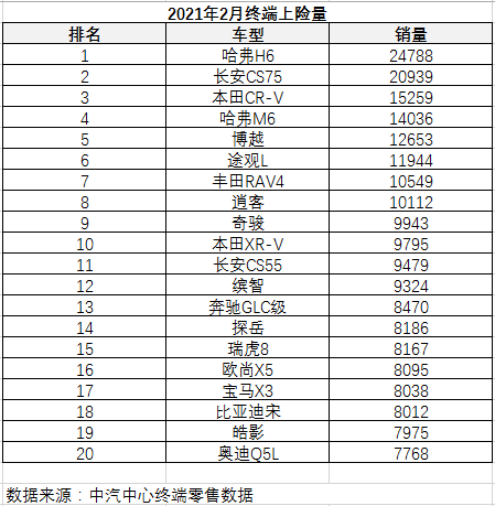 基于此,有不少人更愿意相信上牌量,即车辆实际上牌(保险)的数量,既不能作假也不可能临时增加,是批发量的实际反馈,更能客观反映市场终端实际销量。如图所示,2月上牌量实际还是哈弗H6拿下了第一,这样结果就非常有趣了。