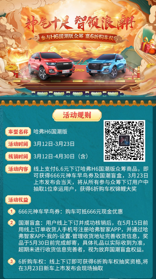 综上所述,哈弗H6国潮版可谓亮点十足,说是“国货之光”毫不为过。它不仅外观设计充满“国潮”气质,更有优异的舒适、智能配置。且值得一提的是,即日起至3月23日,在哈弗智家APP(图中二维码扫描即可)官方商城支付6.6元参与众筹活动,即可获得666元购车现金优惠,以及国潮盲盒礼品一份。同时在3月23日还将在此次参与众筹活动的用户中抽取一位幸运“锦鲤”,享6折购车优惠。心动不如行动,快来参与吧!