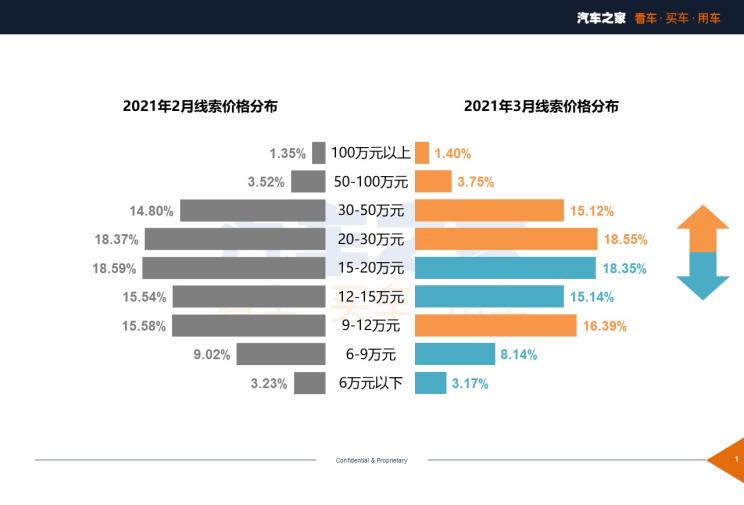 文中的“购车热度”指在相应领域的销售线索占比。销售线索不是市场销量也不是网页浏览数据,是用户通过本站的电话系统等,形成意向购车的条数。销售线索是离用户最后下单购车最近的一个衡量指标,对市场走势具有重要的参考、预判价值,从线索到订单会有几周或几月的延迟,如2021年1月的线索数据,除在当月被消费,部分会延迟到2021年2月-3月。