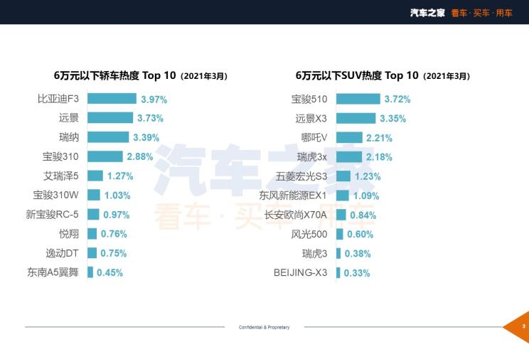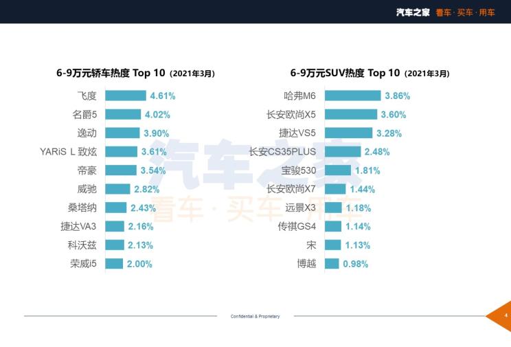 在这个价格区间内轿车的排名与2月份相比是一点变化也没有,非常稳定。而SUV排行榜仅是在第十名的位置由BEIJING-X3车型超过了长安欧尚科赛5,但整体热度都是在降低的,这也是因为车展前夕大家购车的欲望并非那么强烈,再加上听到了不少新车消息,所以在占比方面变化并不明显。