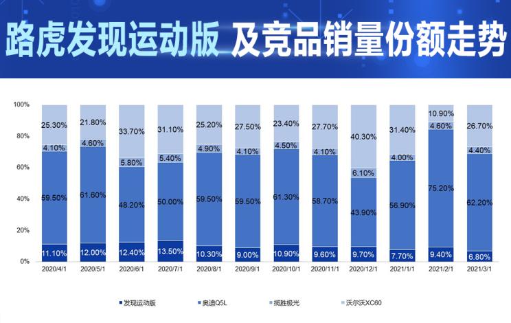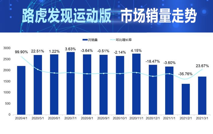 2021年3月,发现运动版销售1724辆,相较上月环比增长23.67%,销量表现不错;今年1-3月累计销量为5288辆,同比增长95.85%。纵观整体中型SUV市场,今年3月及1-3月累计销量同比增长率分别为96.7%和79.0%,3月单月销量表现强劲,累计销量表现十分亮眼。发现运动版在累计销量上实现了对中型SUV市场大盘的超越。