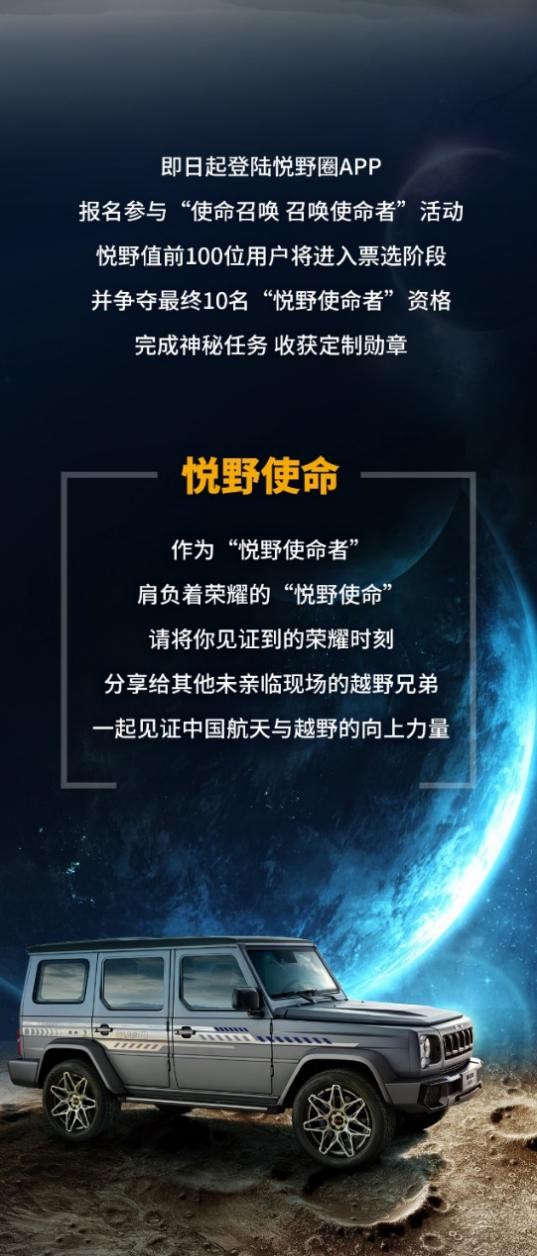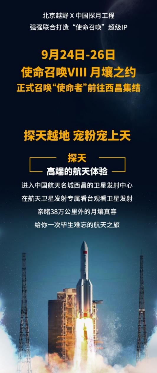 即日起,北京越野在悦野圈APP正式开启“使命召唤 召唤使命者”征集行动,北京越野车主可登陆悦野圈APP报名参与,报名者中悦野值前30名用户将进入票选阶段,并最终争夺10个“悦野使命者”资格。获资格者将进入西昌卫星发射中心,参与使命召唤第8季行动全部环节,完成神秘任务,亲历盛况并分享给无缘到场的越野兄弟,共同见证使命荣耀时刻。