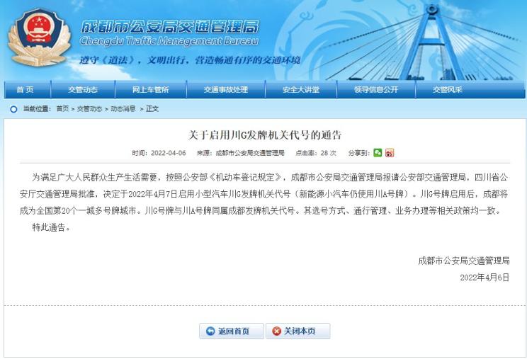 [本站 资讯] 近日,成都市公安局交通管理局发布《关于启用川G号牌机关代号的通告》,决定于2022年4月7日启用小型汽车川G发牌机关代号(新能源小汽车仍使用川A号牌)。以下为通告原文: