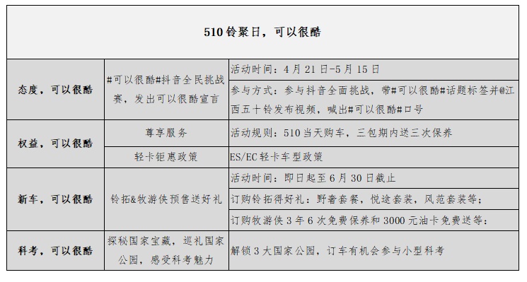 特殊形势,江西五十铃品牌销量依然实现逆势增长,离不开用户的信赖与支持。以“510铃聚日”为契机感恩回馈广大铃粉,江西五十铃带来四大用户权益福利。