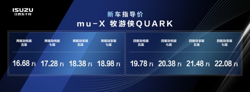 两款车型均配备业界领先的2.0T汽油超强动力、搭载豪华车专属采埃孚8AT自动变速箱,其中,铃拓GANK共推出8款车型,官方指导价13.68万-18.28万元;以独家大空间全感官智能座舱等制霸越野圈的mu-X牧游侠QUARK,共推出8款车型,官方指导价16.68万-22.08万元。