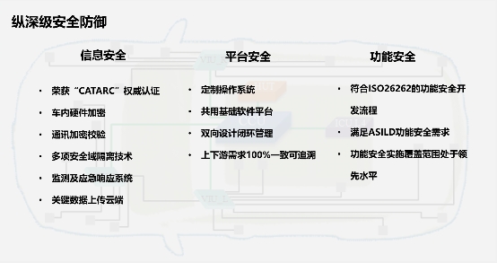 功能安全上,长城汽车为了提升功能安全开发过程质量,建立了完整的符合ISO26262的功能安全开发流程,覆盖整车所有电子架构功能和系统。其全新电子电气架构融合冗余感知、冗余控制、冗余执行、冗余供电及冗余通讯,最高可满足ASILD功能安全需求,当前的功能安全实施覆盖范围在国内自主品牌处于领先地位。
