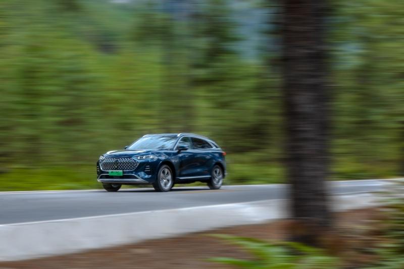 重新驶入G318国道,车速提升,智能DHT两挡架构体现出独有优势。中速巡航时,发动机动力挡直驱模式启动,缩短了动力传递路径,大速比齿轮组直接驱动或与电动机混联驱动,增大扭矩输出,提升整体动力加速性能,驱动电机随时准备介入,以便动态调节发动机最优经济性工作区域,提升效能;当车辆达到一定高速时,发动机切换至更经济速比的齿轮组直驱,也就是发动机经济挡直驱模式,此时发动机转速仍然处在经济区,保障了燃油效率,相比同级增程式、纯燃油车,燃油损耗更少,续航更长。