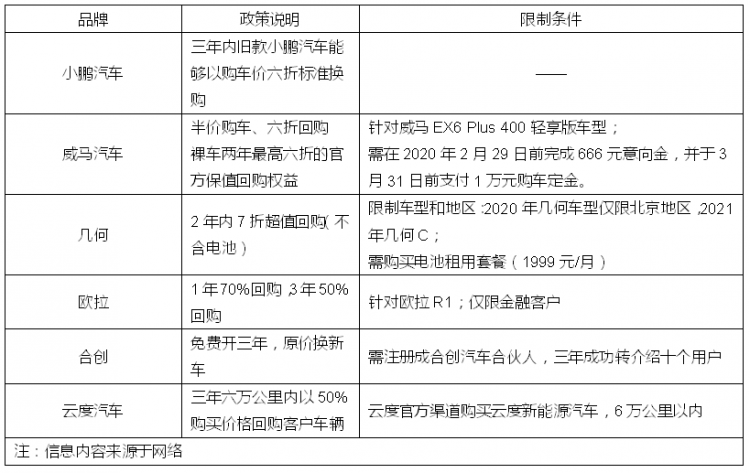 此外,还有一部分车企推出了“保值回购”的方案,如小鹏、威马、几何、长城欧拉、合创、云度等车企,解决方案可谓多种多样。