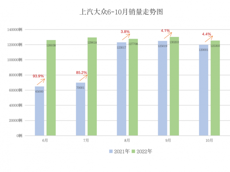 其中,最具代表性的莫过于上汽大众。据乘联会数据显示,10月份的销量为12.5万辆,同比上涨4.4%;1-10月份累计销量接近109万辆,同比上涨12.1%。值得一提的是,自6月份以来,上汽大众已接连五个月实现了销量的正增长,相比于去年同期的表现更好。这其中的原因有很多,上汽大众的战略转型对产品力的提升显而易见。
