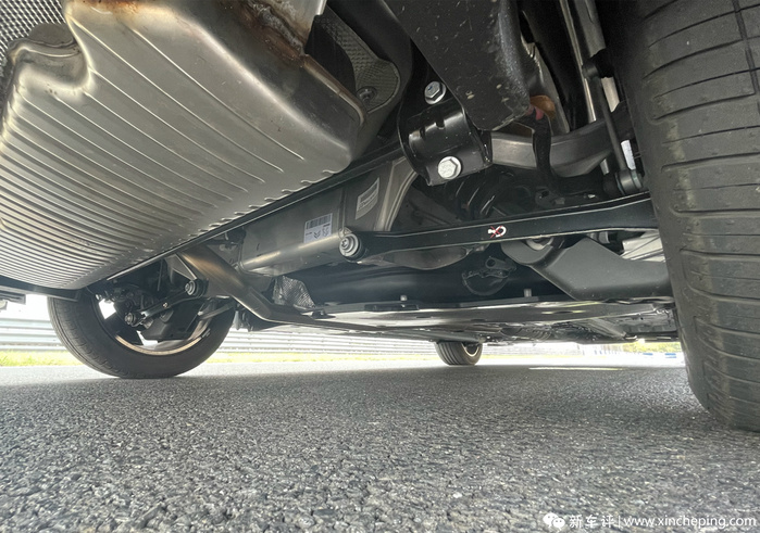 该车的后悬挂是一大亮点,因为它采用了同级别少见的全铝合金副车架,全铝合金材料可以保证刚性之余提供更好的轻量化效果,副车架连接车身,振动会由副车架进行二次过滤,同时它还有斜置的45°避震器,侧向支撑力更足,两边对称的斜置避震器呈现八字形结构,能让车辆开起来更稳,并且它还采用了成本更高的液压衬套,相比起橡胶衬套,液压衬套对悬挂的振动有更好的吸收效果。
