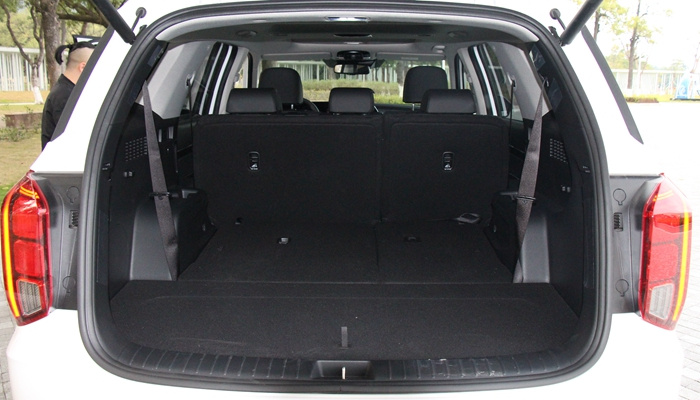 对于这种尺寸的SUV,其实尾厢空间是不太需要顾虑的。在第三排不坐人的情况下,全平地台属于基本操作,整体横宽都非常富裕。另外为了保证便利性,尾厢后方也设置了电动按键,可以一键降倒第三排。(而且不能像昂科旗一样兼顾升降,但海外版本的高配帕里斯帝是可以做到的)