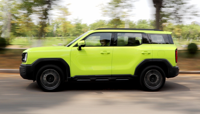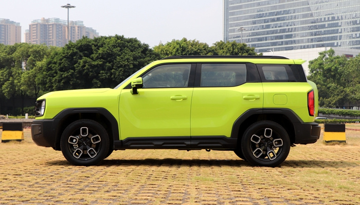 车身侧面依旧是方正的造型搭配悬浮式车顶,尤其是C柱附近的玻璃窗面积明显更大,进一步延长视觉观感。