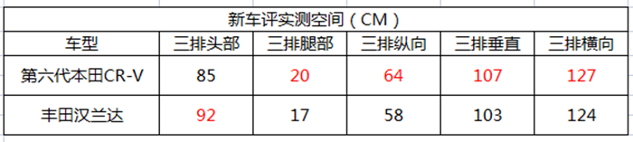 不过从数据上来看,第六代本田CR-V在第二排乘客腿部调整为30CM的情况下,它除了头部不如丰田汉兰达外,整体的数据上都是更加优秀了。硬要再给汉兰达找一个优点,可能就是第三排靠背的可调幅度更大一些。所以也不得不佩服本田,在小了一个级别的情况下,第三排空间数据都能做得更好,不愧是MM理念的贯彻者。