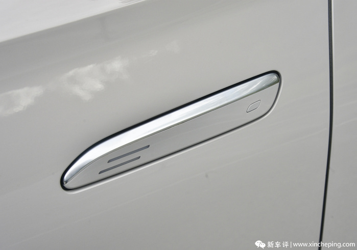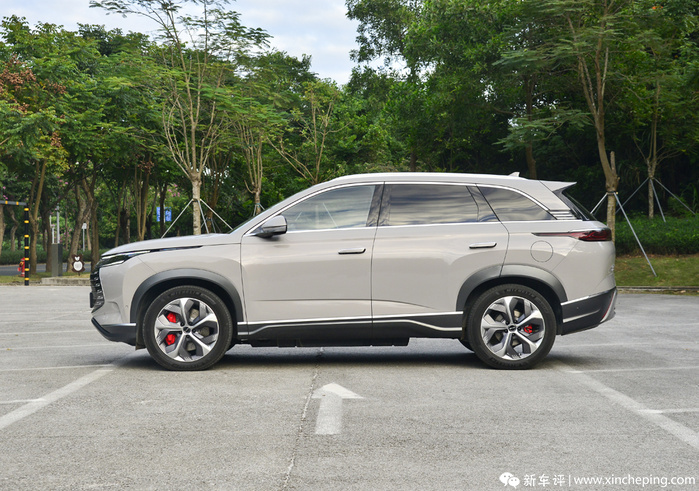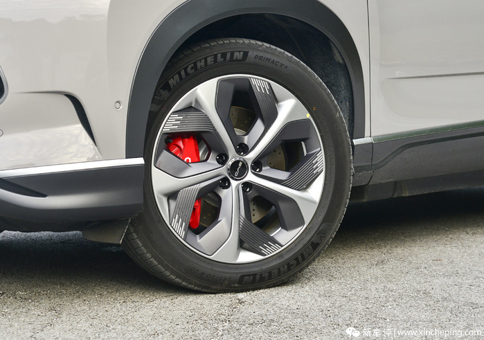 侧面造型四平八稳,大尺寸+圆润线条的组合能让它的侧面更耐看,车顶使用上贴顶式行李架,门把手为时下流行的隐藏式,并且把手的设计也融入了海洋的灵感。轮毂造型简约又不失力量感,实拍车的轮胎是米其林的浩悦4。