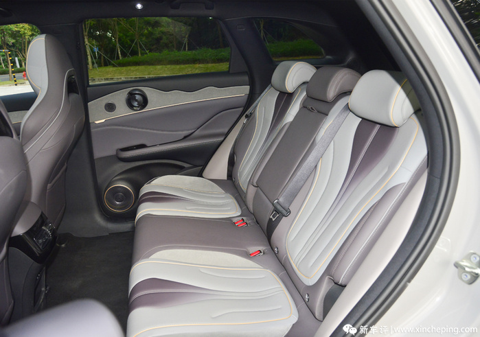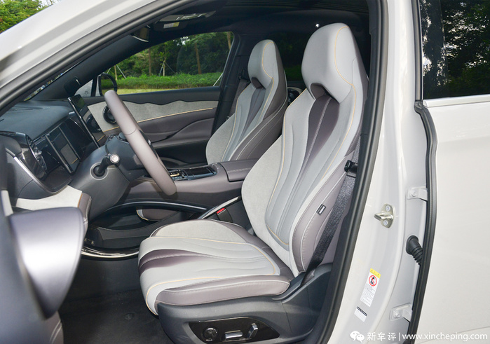 座椅为一体式运动座椅,是当下流行的设计元素,能加强车内的主观运动氛围。座椅的设计元素较为繁复,线条丰富之余还加入少量的金色点缀,这能让座椅的流线感更强,座椅两侧有翻毛皮的材质,这设计与门板上的形成呼应。当然,由于这是油电混动车型,电池组放在在下方,所以整款车的坐姿会稍微高一点。