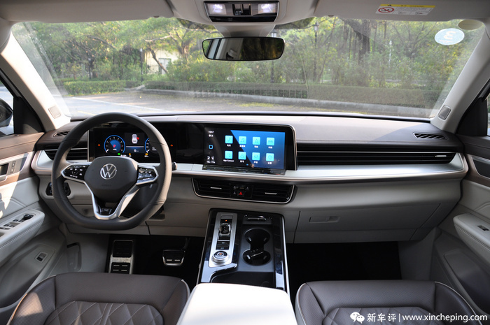 方向盘采用了大众最新的轻触式方向盘,前方是10.25英寸液晶仪表和12英寸中控屏组成的双联屏,中控前方配备了触摸式的空调调节面板。电子档杆也变成了小方块造型,有保时捷内味了。档杆后方是驾驶模式切换旋钮,手机无线充电面板位置还集成有两个Type-c充电口,换挡控制区域底部还挖了一个置物空间。看得出来,揽巡的内饰设计在很努力地向新能源车靠拢。
